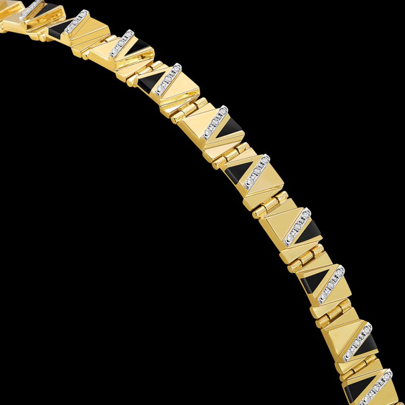 One of the most powerful pieces I’ve ever designed, the Excalibur does a magnificent geometric dance on your wrist with a perfect interplay of 14K yellow gold, black onyx, and sparkling pave’-set diamonds.