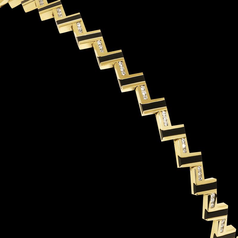 Over one carat of bold, contrasting channel set diamonds and inlaid Onyx conveys a strong sense of movement that brings life and style to the wearer.