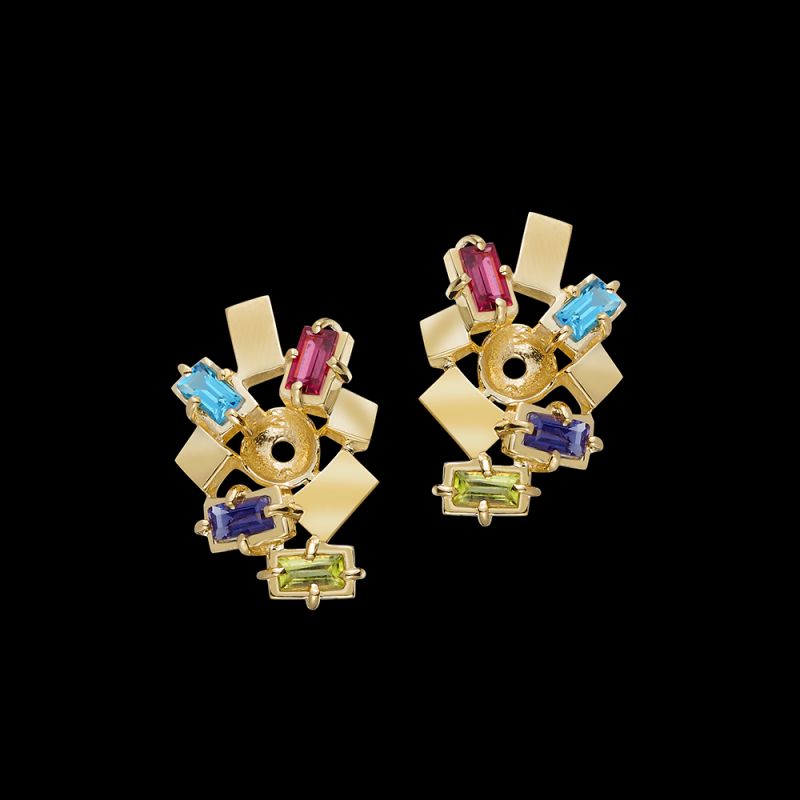 Add your own diamond, pearl, or colored gemstone to the center of these colorful jackets! Peridot, iolite, blue topaz, and rhodolite garnet baguettes are set in 14K gold to create a swirling mosaic on the ear. Add our 1 carat Teal topaz studs in the center for a delightful color addition to what you have.