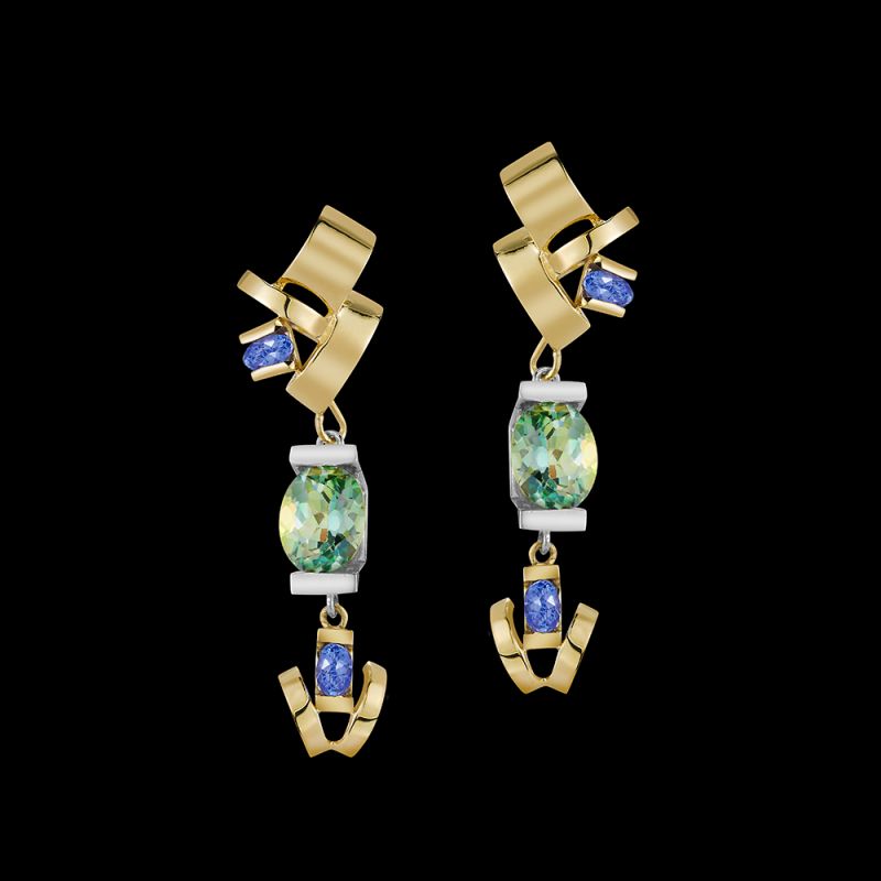 Brighten your world with some color! Celadon green topaz and tanzanites unite to perfectly create a strikingly sophisticated color combination in these soft and elegant dangle earrings.14K and Sterling Silver. Also see the Avalon ring ,pendant, and bracelet for a spectacular ensemble!