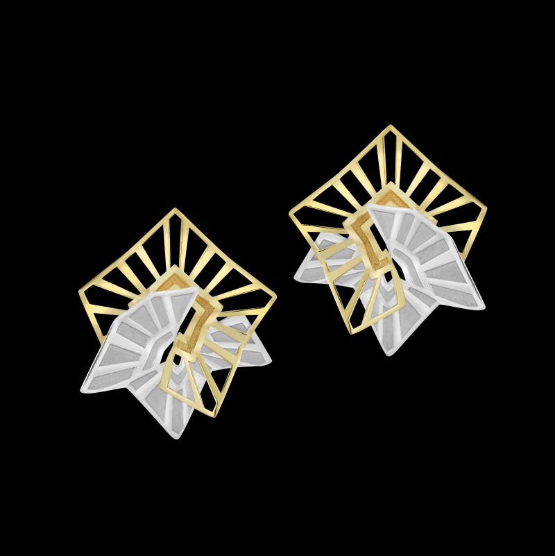 Incredibly intricate detailing creates a celestial delight in these 14K gold and sterling silver earrings. Open gold fretwork contrasts with subtle, sandblasted silver in a perfect interplay.