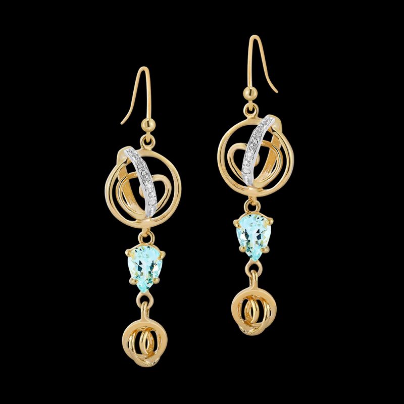 These graceful, intricate earrings in 14 karat gold feature gorgeous yet subtle vibrant pear-shaped aquamarines, highlighted with a sparkling arc of pave-set diamonds. Check out the matching Harmony Bracelet, as well as the stunning Cleopatra Enhancer with aquamarine.