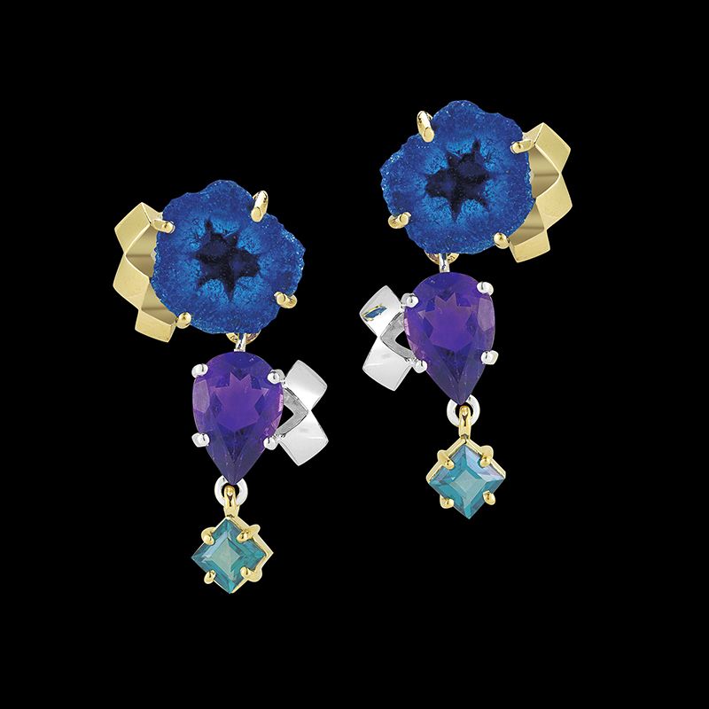 Extremely rare and gorgeous Azurite Druzy Geodes are the feature in these exotic earrings, along with African amethyst and teal topaz. All 14K gold. Create a fabulous ensemble with the matching Nebula Pendant and Bracelet.