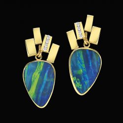 Detachable matched Australian opal descends from rectangles of shiny gold and channel-set diamonds in a dazzling display of color and light.