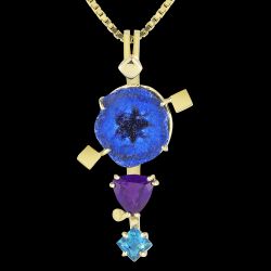 Extremely rare and beautiful Azurite Druzy Geodes are featured in this exotic drop pendant, along with African amethyst and Teal topaz. All 14K Gold. Create a fabulous ensemble with the matching Nebula Earrings and Nebula Bracelet!