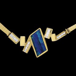Bezel set, hand cut Australian Boulder opal combines with channel-set diamonds and strong angles in 22 karat and 14 karat gold to strike a playful and elegant balance. Matching bracelet and earrings complete the set.