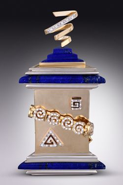 A triangular sterling silver and hand-carved lapis lazuli box is accented by a Royal Swirl stickpin top and wraparound Diamond Swirl bracelet. Detach and wear these lovely pieces to the Celebrity Ball, or to the office.