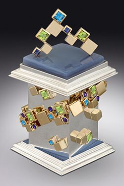Shades of Mondrian! This Contemporary-meets- Cubism Art Box in sterling silver and 14K gold features a wraparound bracelet and stickpin brooch which may be worn to the opera, and redeployed on the box to enjoy as a most special Objet d’Art.
