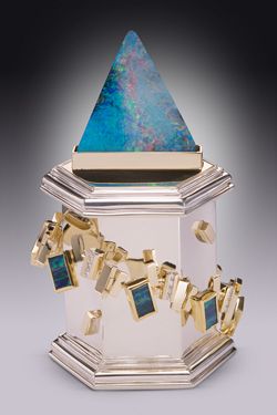 A Revelation bracelet in 22k and 14k gold, channel-set diamonds and Boulder opal wraps around a hexagonal sterling silver and 14k gold box. The large triangular Boulder opal is a detachable stickpin. Price on request.