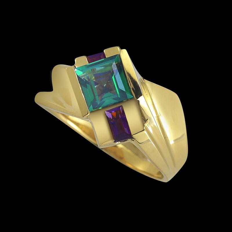 A graceful 14K gold fusion of Deco and Contemporary styles culminate in the Contempo series. A Princess-cut Teal topaz floats above channel-set African amethyst baguettes in this ultra smooth and comfortable ring.