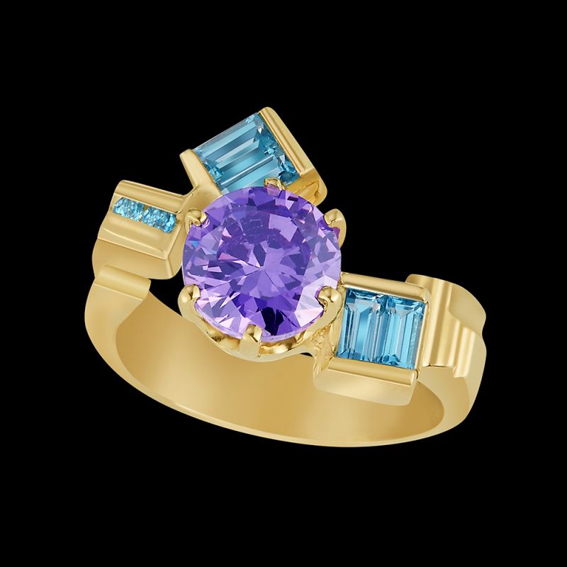 Extremely rare lavender Sapphire surrounded by channel-set blue topaz baguettes creates a serene and downright yummy color combination in this perfectly proportioned, architectural ring.