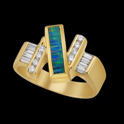 Rare, spectacular, and highly colorful inlaid Australian Boulder Opal is framed by baguette and round channel-set diamonds in this Art Deco inspired, architectural ring.