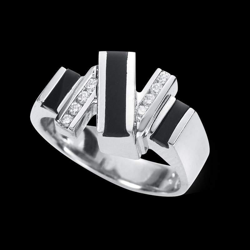 Bold, contrasting channel-set diamonds and inlaid onyx on white gold conveys a strong sense of movement that brings life and style to the wearer. Matching bracelet and enhancer available.