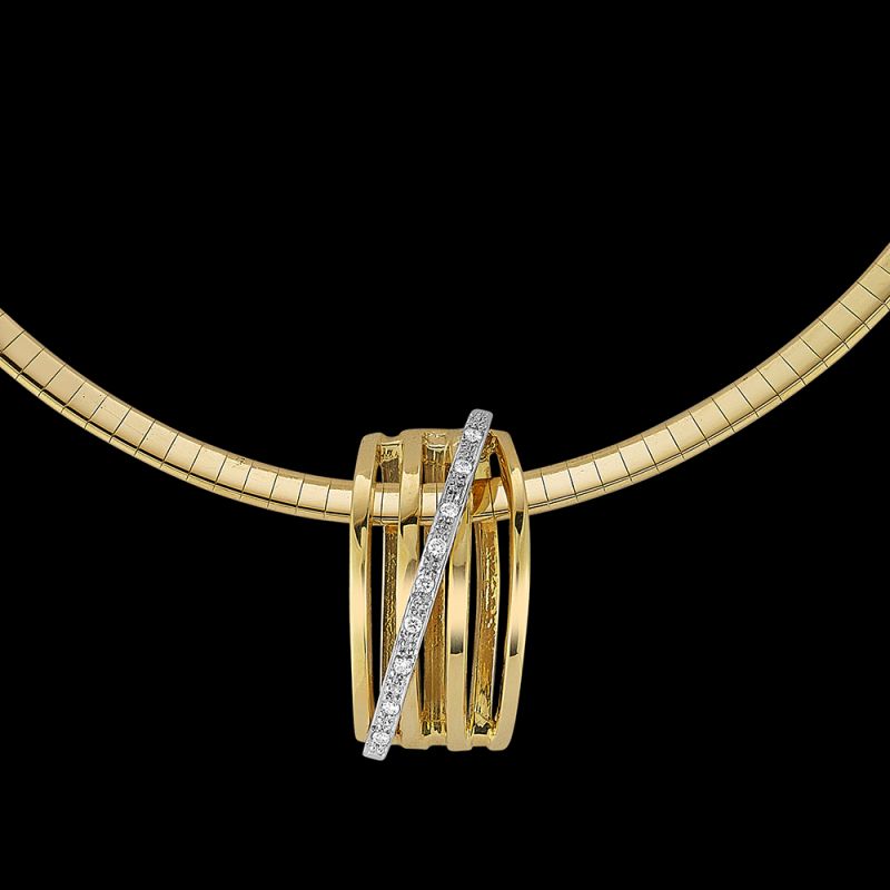 Jazz up your Omega Chain! This stunning pendant showcases a series of intersecting linear bands to create a dynamic, geometric aesthetic. Accented with brilliant diamonds, this piece exudes sophistication and grace. Can be worn on larger “Omega” chains as shown, or any other chain you may have. Check out the complete series!